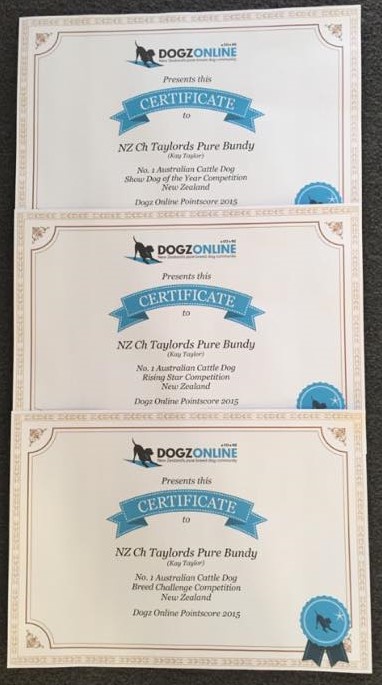 Big Congratualtions to Bundy for an awesome 2015! ~ NZ No.1 Australian Cattle Dog (D.O.L Pointscore) AWESOME start to the 2016 show year! Congratulations to 'Hurley' ie: (Taylords Royal Ringleader) for winning Baby Puppy of GROUP at his first outing at East Coast Ladies Kennel Assn under judge Mrs L Harris (Tas) Results from Poverty Bay Kennel Assn (7th & 8th November 2015) under judges John Perfect & Polly Middleton Bundy: